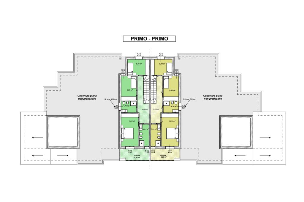Al piano primo: 1 camera matrimoniale - 1 camera da letto singola - 1 camera da letto singola - 2 bagni - ampio loggiato coperto accessibile dalla camera matrimoniale
