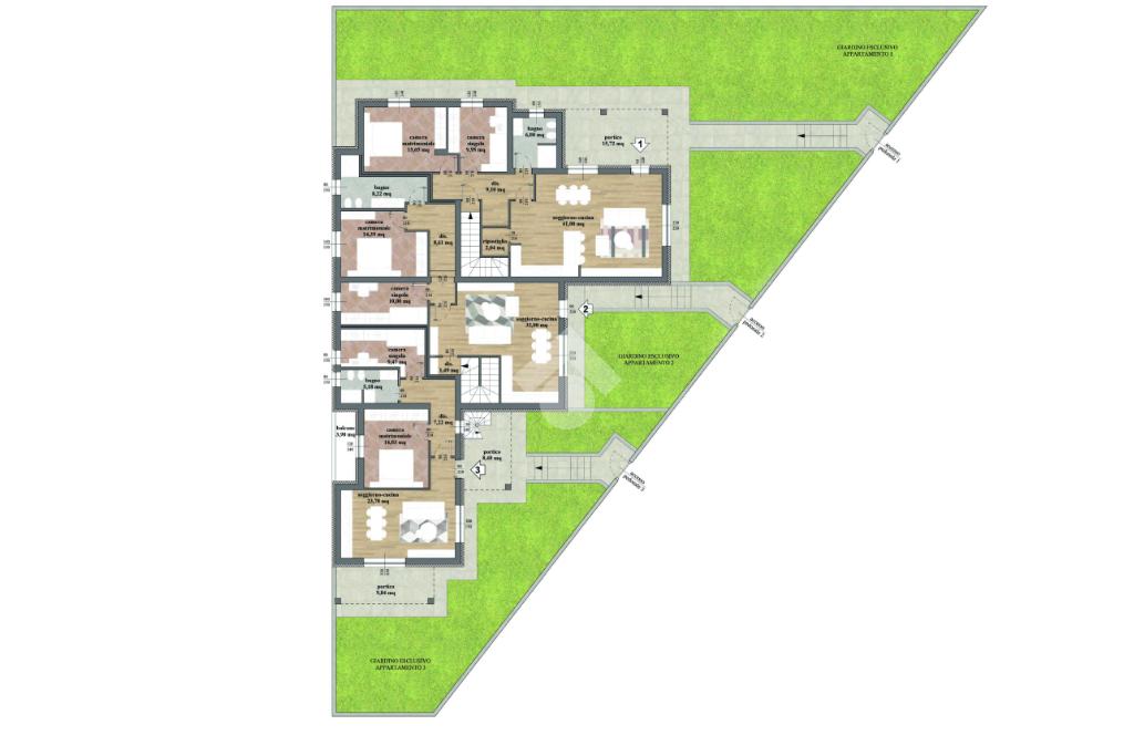 Soggiorno - cucina - camera matrimoniale - camera singola - bagno - disimpegno - ripostiglio - giardino - portico